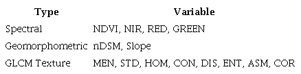 We calculate three types of derived variables from the input variables: spectral, geomorphometric, and texture, which are listed in Table 6.