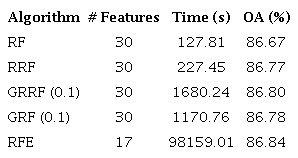 Regarding the feature selection algorithms, the most significant difference between the OAs reported in Table 8 was 0.17%, between the RFE algorithm and RRF family algorithms, in contrast to the processing times, where RFE had an increase of 59 times (approximately 27 hours) compared to the RRF family algorithms. These results showed that although the RFE algorithm presented the best performance, its computational cost is not comparable with that of the RRF algorithms' family. Processing time was calculated using a computer with a four-core processor, each with a 2.20Ghz processing speed and 8GB RAM.