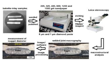 To conduct the macrostructural analysis of the welded joints, the samples were transversely sectioned, inserted in bakelite, sanded and polished to a mirror finish. The polished samples were then etched with Vilella's solution during 10 s and rinsed with running water for about 30 s. Macrographs obtained with a Leica stereoscope were used to analyze the influence of the Zn coating on the nugget diameter. For the analysis of the macrographs, digital image processing techniques were applied using the ImageJ 1.48v software. Three measurements of nugget diameter were made per experimental condition. Fig. 2 shows the diagram of the procedure used for sample preparation and macrostructural analysis.