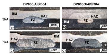 The asymmetry of the nugget, characterized by greater penetration on the side of the AISI304 plate, was increased when used the DP600 plate with Zn coating in the joint (Fig. 3b and d). Differences in the thermal conductivity and electrical resistivity of two steel sheets led to an asymmetrical weld nugget in dissimilar metal joints [19]. In Fig. 3b, it can also be observed, that the FZ is completely developed in the AISI304 side, so that an adequate DP600G/AISI304 welded joint is not achieved for the experimental condition of 3 kA and 500 ms. On the other hand, in addition of the nugget asymmetry, the DP600G/AISI304 welded joint obtained for 5 kA and 500 ms suffered plastic deformation at the edges of the nugget, as can be seen in Fig 3d. The causes of this deformation will be analyzed later in this work.