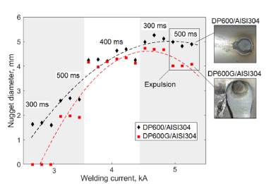 Zn coating produces of two times longer delay on the time needed for the nugget formation in the DP600G/AISI304 welded joints in comparison with DP600/AISI304 joints. Similarly, the expulsion time was delayed by 1.12 times.