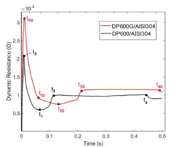 The delay caused by Zn coating in the beginning of nugget formation also influences the expulsion, which takes longer in the DP600G/AISI304 welded joint (12% higher), compared to the DP600/AISI304 weld, as shown in Fig. 5. Similar dynamic resistance behavior was obtained for all other experimental conditions, except for expulsion that only occurs at I = 5 kA, t = 500 ms.
