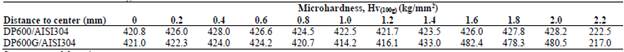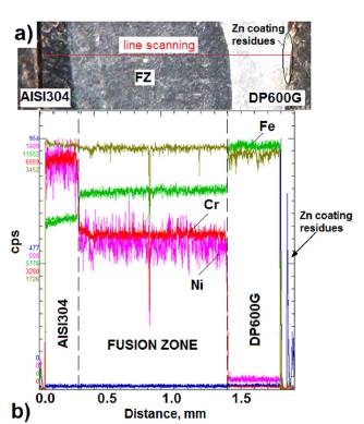 Fig. 6 shows the chemical element line scanning results of the WDS analysis performed on the cross section of one of the samples of the DP600G/AISI304 welded joint obtained for 5kA and 300 ms.