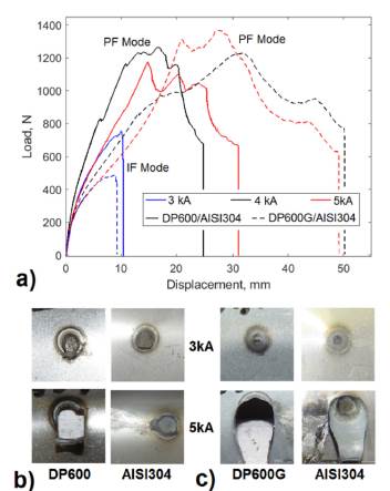 Fig. 7a shows the load-displacement curves obtained in peel tests for current of 3, 4 and 5 kA and weld time of t = 500 ms. It was found that the highest peak load value (1384.16 N) was reached for the DP600G/AISI304 joint, with a welding current of 5 kA, even though a smaller nugget diameter (4.02 mm) was obtained for this joint. For the conditions shown in Fig. 7a, the largest nugget diameter (4.21 mm) was obtained for DP600/AISI304 joint at current of 4 kA and 500 ms of welding time, for which a peak load value of 1265.14 N was obtained.