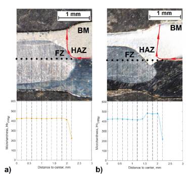 A Vickers microhardness tester SHIMADZU HMV-G was used to obtain the hardness profiles covering base metals (BMs), heat-affected zone (HAZ) and fusion zone (FZ) along the sheet-sheet interface; under 100 g indenter load and 15 s dwell time. The hardness indentations were spaced 200 μm apart. Three measurements were conducted for each experimental condition, and average microhardness values were calculated. Both tensile and microhardness tests were carried out in accordance to the AWS/SAE/D8.9:2002 [15].