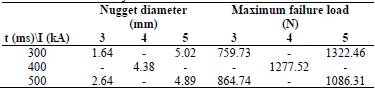 Load-displacement curves for all welded joints obtained for a welding current of 3 kA show a characteristic behavior of the interfacial failure (IF) mode (Figs. 7b and c). For 3 kA, the peak value of the curve corresponds to the initiation of the fracture, which rapidly propagates into the nugget causing the load values to fall drastically to zero. For current values of 4 and 5 kA, pull-out failure (PF) modes were observed. The failure modes change from IF to PF with increasing welding current and nugget diameter. Similar results were obtained by Alizadeh-Sh et al. [26]. Figs. 7b and c, show images of the failure modes occurred for the conditions of t = 500 ms and welding current of 3 and 5 kA, respectively. The occurrence of expulsion for the conditions of 5 kA and 500 ms is observed.
