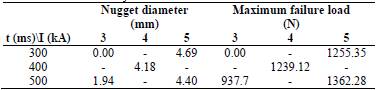 During the experiment, welding current (I) of 3, 4 and 5 kA, three values of weld time (t): 300, 400 and 500 ms, and the presence or not of galvanic coating on the DP600 steel were used with the aim of evaluating the influence of the Zn coating on the mechanical strength of the welded joint. All welds were randomly performed three times to reduce experimental error. The values of the electrode force, squeeze time, post-weld holding time and up-slope welding current were kept constant.