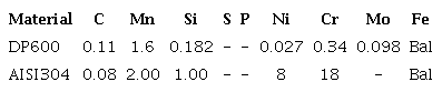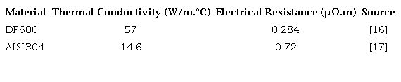 Stainless steel (AISI304) and dual phase steel (DP600) with a thickness of 1.2 mm were used in this experiment. The DP600 steel with a 14 galvanic coating per side (DP600G) was used to study the influence of Zn coating on the welding process. The chemical composition and thermophysical properties of the base metals are shown in Table 1 and 2, respectively. The sheets were cut to a dimension of 120 x 38 mm as described in AWS D8.9M:2002 [15].