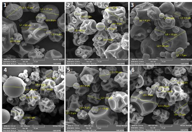 The compounds were encapsulated with maltodextrin, and microcapsules presented spherical structures with smooth surfaces and no grooves when analysed by scanning electron microscopy. The only samples which were composed by a few spherical and smooth particles were formulation 2(ethyl acetate/ gum Arabic), 4 (a sample of ethyl acetate with 15% dextrin and 15% maltodextrin) and 5 (natural aroma /dextrin). In these formulations, there was retention of volatile compounds of 25.92%, 42.46% and 69%, respectively. According to the figures below, all samples had particles ranging from 2 to 25 μm and grooves on the surface.