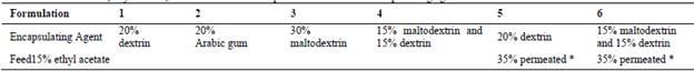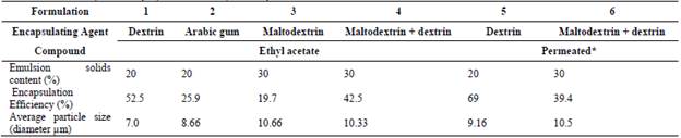 The formulations initially proposed to obtain the powdered aroma can be found in Table 1. Formulations with ethyl acetate standard (>99.5%, Vetec) were tested In order to define the most suitable encapsulating agents. The formulations were prepared with the addition 15 mL of ethyl acetate in 100 mL of the emulsion prepared with addition of the encapsulating agent in water under magnetic stirring. Following identification of the best encapsulating agent, tests were performed with natural flavour (fermented and concentrated/permeated aroma) in an emulsion with the encapsulating agent according to Table 1. The samples were resuspended after drying (0.1 g of the dry powder in 5 mL of 1% NaCl solution) and analysed by GC. The natural aroma produced by fermentation and concentrated by pervaporation was microencapsulated after selection of the best encapsulating agent, according to the encapsulation efficiency and characteristics of the microcapsules (size and formation of grooves).