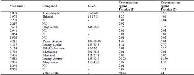 Isoamyl acetate and isoamyl alcohol were identified in both fractions at significant concentrations. The latter compound has also been reported by Kong et al. [29], who used Pichia fermentans and Saccharomyces cerevisiae to change the aroma of wine. Table 2 shows the presence of compounds such as acetaldehyde, 2-heptanone, propyl acetate etc. and others that were not identified. This indicates that in the fermentative process, different metabolic routes predominate. Some aroma compounds were detected and identified by GC/MS and did not appear in the CG/FID analysis.