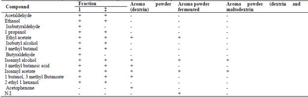From the results obtained in tests using ethyl acetate, the encapsulating agents dextrin and maltodextrin were the most efficient at retaining aroma compounds. These agents were used to encapsulate the natural aroma obtained by fermentation. In microencapsulation, the aroma produced by fermentation without any downstream process was called 'fermented', and the aroma recovered and concentrated by pervaporation was called 'permeated'.
