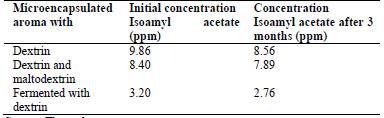 After 3 months of storage, the samples were resuspended and analysed in GC by HS-SPME. All the samples were stable (Table 5) with regard to the concentration of microencapsulated isoamyl acetate. There was a decrease of 13.18% in the microencapsulated aroma with dextrin, 6.07% in the mixture of dextrin and maltodextrin and 13.75% for the fermented microencapsulated aroma with dextrin.