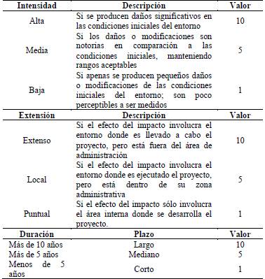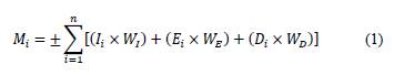 Donde M, I, E y D representan, respectivamente la magnitud, intensidad, extensión y duración del impacto, y Wi, We y Wd, son variables adimensionales que ponderan el peso de incidencia sobre cualquiera de las variables; la suma de estos tres coeficientes de peso debe ser igual a 1, y se le asigna valores arbitrarios a cada una de las variables en el intervalo (0, 1). Para esta investigación los valores asignados fueron WI= 0.4, WE= 0.4 yWD= 0.2 [18].