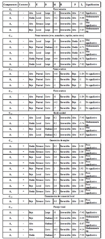 Después de obtener el Iv de cada uno de los impactos evaluados en el proyecto los resultados son tabulados para su respectivo análisis. En base a los resultados del Iv, se realiza una calificación cualitativa, la cual permitirá tomar decisiones sobre las medidas de mitigación que deben aplicarse de manera prioritaria, y para ello, se toma en cuenta un criterio de significancia dado a continuación: En el intervalo (0, 2) el impacto es no significativo; de (2, 4) el impacto es poco significativo; entre (4, 6), es medianamente significativo; en el rango (6, 8), es significativo; y entre 8 y 10 el impacto es muy significativo [6].