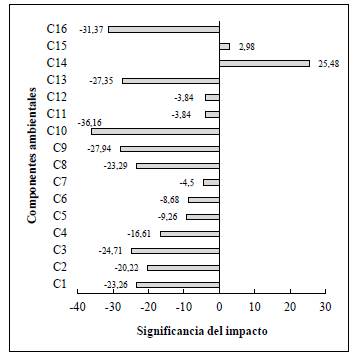 En la Fig. 4, se muestra la distribución de porcentajes de significancia del impacto ambiental con los componentes ambientales presentes en la cantera de San Luis de Alba. Se observa que el componente fauna terrestres es el que sufrió el mayor impacto ambiental como consecuencia de la extracción de rocas (o ruptura de la roca) y la preparación de vías de acceso a la cantera de San Luis de Alba, al registrarse un índice IV total de -36.16; y la afectación de este componente, también se vio afectada directamente, por el daño producido a los componentes topografía (C1) y suelo (C8), evidenciado en el índice IV total -23.26 y -23.29, respectivamente. Pero cabe señalar, además, que la flora terrestre también, sufrió un impacto negativo registrando un IV negativo igual a -27.94.