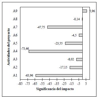 En la Fig.5 se señalan los valores del IV en relación a las actividades diseñadas para el proyecto. De las 9 actividades apenas 1 de ellas obtuvo un índice IV positivo igual 5.96 correspondiente a la actividad de comercialización. Mientras que las actividades de extracción (A4), tienen un impacto negativo de 73.46; la actividad preparación de vías de acceso (A1) registró un índice igual a -63.96, y la actividad carguío y transporte (A7) obtuvo un índice total igual a -47.75. Estos resultados, indican claramente los efectos adversos que tiene la explotación y extracción de los recursos en la cantera de San Luis de Alba, y de la inversión que se requiere para aplicar la medida de mitigación que reduzcan los impactos negativos generado sobre los componentes ambientales presentes en dicha cantera