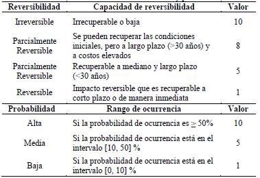 Por último, se mide la probabilidad de ocurrencia del impacto ambiental sobre los componentes ambientales presentes en de alcance del proyecto tanto internos o externos, según sea el caso. La escala de valoración de la reversibilidad de impacto y la probabilidad de ocurrencia se muestra a continuación en la Tabla 2. Una vez realizada la caracterización del impacto ambiental a través de la cuantificación de las variables antes mencionadas, se procede a determinar el índice de valoración de impacto ambiental IV, el cual toma en cuenta la relación directa entre la reversibilidad, el riesgo y la magnitud, tal como se muestra en la siguiente ecuación: