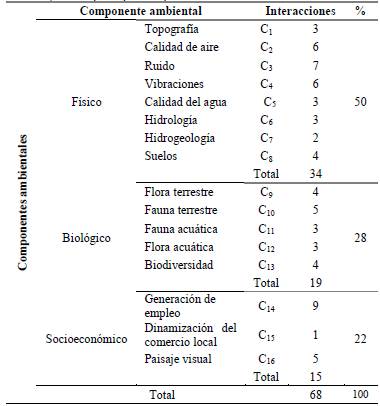 De acuerdo con lo observado en la Tabla 4, se determinó el nivel de afectación de cada componente ambiental mediante el recuento de sus interacciones con cada actividad desarrollada. Lo anterior se observa en la Tabla 5, donde el 50% de los indicadores evaluados corresponden a los componentes ambientales físicos, el 28% está representado por los indicadores de los componentes biológicos, y el 22% a los indicadores de los componentes socioeconómicos.