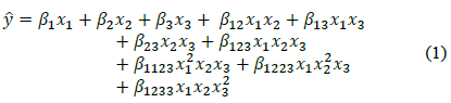 is redundant for any mixture design with i components. This study was based on a particular quadratic model (Eq. 1) that considers higher-order effects such as ternary interactions, increasing the cubic model with higher-order quadratic interaction terms [22].