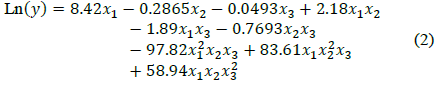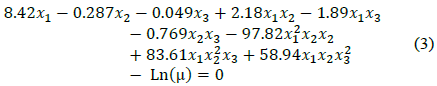 Where, у is the response variable (polymer solution viscosity), and the factors x1, x2 and x3 correspond to the variables studied. The parameters ft, 𝛽1, 𝛽2, 𝛽3, 𝛽12, 𝛽𝛽13 𝛽23 𝛽123, 𝛽1123, 𝛽1223, and ft233 are the model interaction components coefficients.
