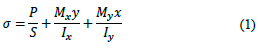 where: σ is the soil pressure anywhere on the footing, S is the contact surface of the footing, P is the axial load applied at the center of gravity of the footing, Mx is the moment around the X axis, My is the moment around the Y axis, x is the distance parallel to the X axis measured from the center of gravity to the point in study, y is the distance parallel to the Y axis measured from the center of gravity to the point in study, Iy is the moment of inertia around the Y axis, and Ix is the moment of inertia around the X axis.