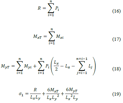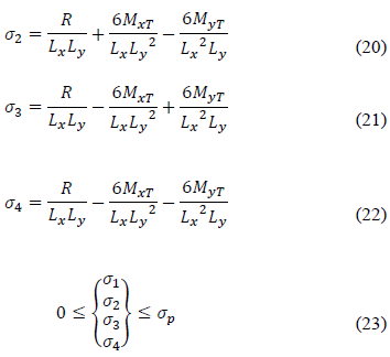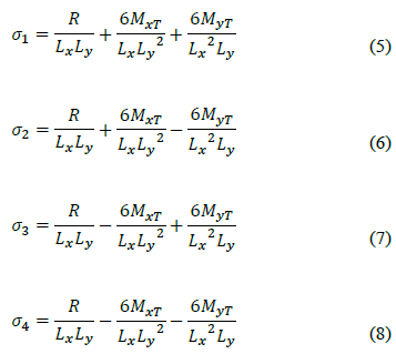 Substituting the eq. (2)-(4) into eq. (1) to find the stresses in each corner of the rectangular footing, these are obtained as follows: