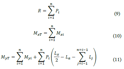 where: R is the sum of all the axial forces, MxT is the sum of all the bending moments around the X axis and MyT is the sum of all the bending moments around the Y axis. These are obtained from the following equations: