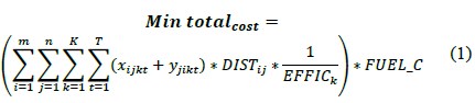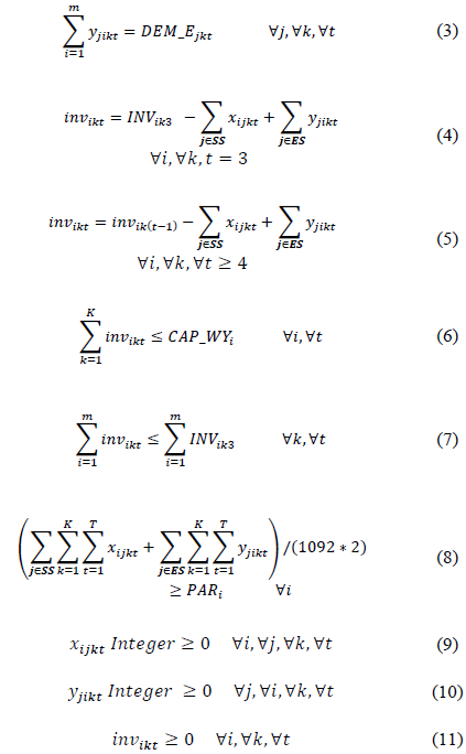 xijkt = Number of type k buses that travel from WY i to stop j in period t (number of buses that enter the system). yjikt = Number of type k buses that travel from stop j to Wy i in period t (number of buses that leave the system). invikt = Number of type k buses parked in WY i at the end of period t.
