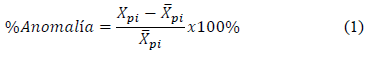 Las anomalias son indicadores que permiten interpretar si en un ano ha llovido por encima o por debajo de lo normal o lo esperado, convirtiéndose estas en herramientas útiles para la determinación de años Niña y Niño [32]. Entonces, con el fin de comparar las anomalias presentes en el conjunto de datos de estudio con los indices macro-climáticos, se optó por calcular la alteración en porcentaje de las precipitaciones en las 11 estaciones observadas dentro de la cuenca utilizando la ec. (1) [33].