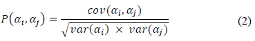 Donde: cov(αiαj) es la covarianza, var(α) es la varianza de i y var(αi) es la varianza de j. De este método de comparación se entiende que cuando el producto de la correlación entre las variables es más cercano a +1, su relación viene siendo más directa y cuando este se acerca a -1, la relación presente se considera como indirecta.