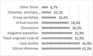 However, Without the figure implying a proportion that completes 100% taking into account that different options were allowed to be chosen, and as can be seen in Fig. 8, a 42.3% of students report that they have already been taught ethics through ethical dilemmas, 40.9% with studies of case, 32.9% with keynote presentations, 30.2% with debates, 28.9% with virtual courses, 15.4% with group workshops and 10.1% with continuing education courses.