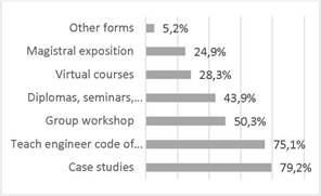 When they mention other forms (6,7%), they comment that group presentations, webinars, debates, social research, and volunteering have been carried out.