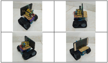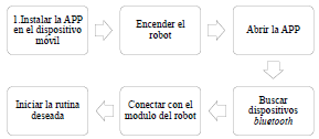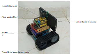 La APP accede y obtiene los datos recopilados por los sensores. Para transmitir estos datos al robot se puede hacer uso de alguno de los métodos de conexión inalámbrica wi-fi o bluetooth disponibles en los dispositivos móviles. El bluetooth tiene mayor grado de aplicación gracias a su facilidad de conexión, emparejamiento sin requerir un router y bajo consumo energético. En el modelo, el dispositivo móvil está instalado sobre el robot, por lo que la distancia será mínima, dejando así el bluetooth en una posición más conveniente para su aplicación (Fig. 3). En las Figs. 5, 6 y 7 se utiliza el símbolo de conexión por wi-fi o bluetooth, para efectos de la aplicación real y pruebas del modelo (Fase 4, Fig. 2). Se hace referencia al robot como el conjunto general de actuadores y componentes estructurales y funcionales para llevar a cabo una función o tarea, de forma genérica. El robot puede cambiar su forma y componentes básicos para cumplir con sus funciones. Usualmente se implementa un chasis estructural para ensamblar los componentes motrices como motores y brindar soporte para instalar los módulos de procesamiento y para este caso, instalar el celular (Fig. 4).