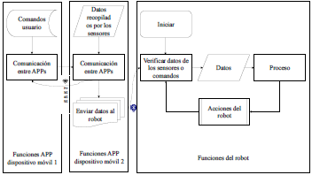 El uso más común que se da de los dispositivos móviles en las prácticas de robótica es la implementación como un mando a distancia para el robot, donde se hace uso de una aplicación desarrollada con una interfaz de botones programados para enviar determinado comando. Estos datos se le comunican al robot por medio de bluetooth, wi-fi, infrarrojo u otro, El robot recibe los datos y en su lógica, procesa el comando para actuar en consecuencia (Fase 2, Fig. 2).