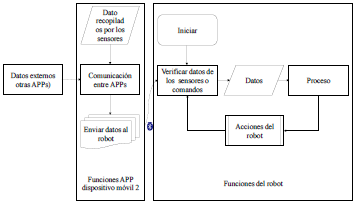 En esta configuración se buscó establecer un desarrollo personalizado de la APP para llamar, vincular o implementar librerías de otras aplicaciones con el fin de procesar los datos e información en el dispositivo móvil. Se utilizó toda la capacidad de procesamiento y memoria disponible en el dispositivo móvil y una vez procesados los datos, enviaba al robot la información y comandos necesarios para ejecutar las acciones. Con este enfoque se logró que el núcleo de procesamiento del robot no requiriera de la interfaz de video, memoria o almacenamiento más allá de lo básico para operar sus componentes principales. Lo anterior, porque los procesos que requieren procesamiento gráfico y de memoria son ejecutados por el dispositivo móvil (Fig. 7). Algunos ejemplos son: