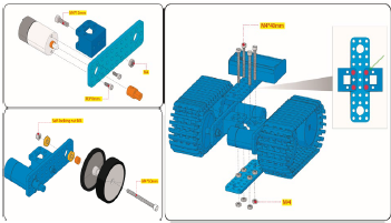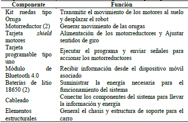 Para la validación del modelo se configuró un prototipo de robot. Por simplicidad para su ensamble y posterior aplicación en otros escenarios, se implementó un carro con llantas tipo oruga, el cual tiene como efectores dos motores para su desplazamiento, y la dirección se puede controlar cambiando la velocidad y sentido de giro de los motores. Los principales materiales o módulos utilizados para configurar el robot se detallan en la Fig. 8 y Tabla 3.