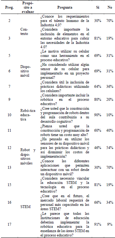 Los resultados de la encuesta reflejan que la implementación de la robótica educativa dentro del pensum de las asignaturas de los programas de ingeniería es bien recibida por parte de los actores del sistema educativo (estudiantes y profesores). Además, muestra la importancia que estos le dan a poder adquirir conocimientos de las áreas STEM, por lo que es necesario crear módulos que permitan brindar a los estudiantes, conocimientos, habilidades, destrezas y competencias en robótica educativa. Además, se evidencia el interés y motivación de hacer mayor el uso de herramientas tecnológicas como el celular en los procesos de enseñanza y de aprendizaje dentro de las aulas de clase, ya que impulsa la creatividad, imaginación, trabajo en equipo e innovación de los estudiantes mediante el aprendizaje más activo y didáctico (Tabla 4).