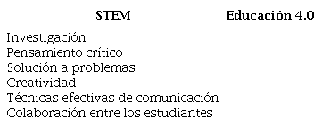 Desde la década de los años 90, con el surgimiento de la Educación 3.0, se identificó la necesidad de tener perfiles completos en estas áreas transversales que involucran un dominio de las matemáticas, ciencias, tecnología e ingeniería. Fue entonces cuando la National Science Foundation (NSF) acuñó el acrónimo STEM (Science, Technology, Engineering and Mathematics) con un enfoque educativo en el cual se ha demostrado tener buenos resultados en el fortalecimiento de estas áreas específicas y ha tenido gran aceptación a nivel mundial generando puentes entre la academia y la industria. Como lo menciona [2]"es conveniente que mediante las TIC se genere interés y fortalecimiento de las áreas STEM en los estudiantes" de ingeniería, las cuales están encaminadas al fortalecimiento de las habilidades para afrontar problemas del mundo real y actual. La educación STEM tiene como principal objetivo potenciar en los estudiantes habilidades y competencias para la investigación, desarrollar el pensamiento crítico, planteamiento de soluciones a problemas reales, incrementar la aplicación de la creatividad, implementando técnicas efectivas de comunicación y colaboración entre los estudiantes. En la Fig. 1 y en la Tabla 1, se muestran el comparativo entre las habilidades que busca fortalecer la educación STEM y las habilidades objetivo de la educación 4.0.