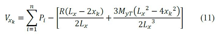 Substituting xk = Lx /2 into eq. (11) considering only the second part that represents the soil pressure, and the shear force on the y1-y1 axis is Vxk = 0.