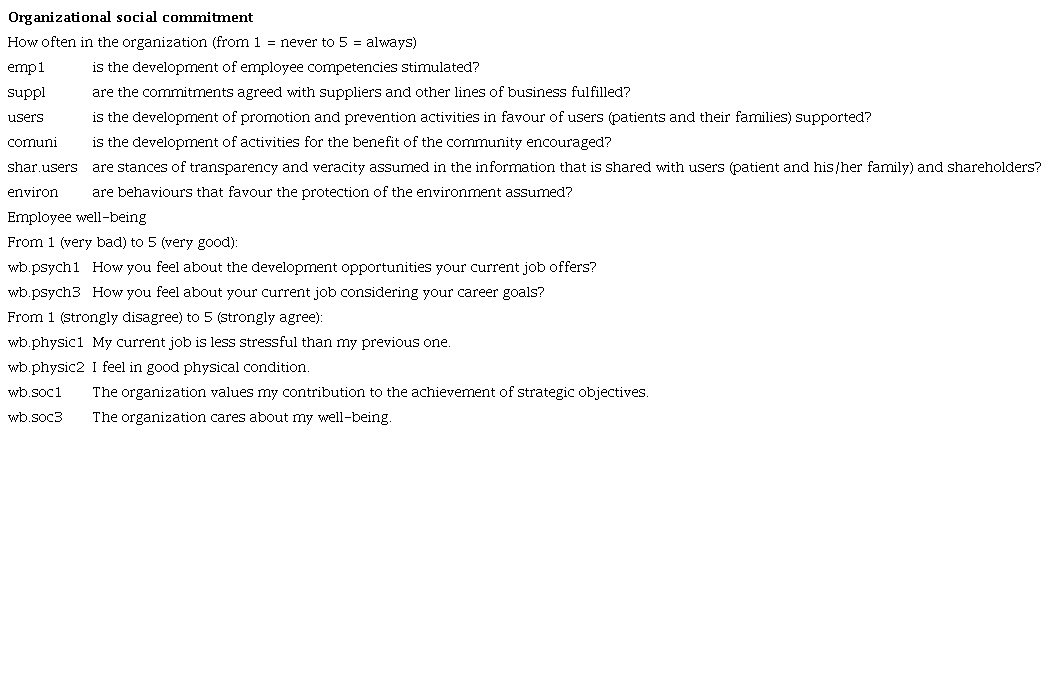 The scenario under study (healthcare) is relevant for investigating the stated aim because it attends to vital needs. Furthermore, the employee reactions to organizational initiatives (e.g. patient-centred care) are induced by the organization’s beliefs about ethical/social concerns [9,15]. Therefore, social progress has become a critical need in healthcare organizations [21].
