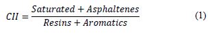 Colloidal instability index (CII) and Gaestel Index (Ic) were determined by eqs. (1)-(2), respectively. Resins/asphaltenes ratio (R/ASP), and Stankiewicz graph, that plots the Saturated/Aromatic versus Asphaltenes/Resins ratios, were also calculated and analyzed.