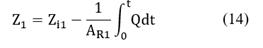 In the preceding analysis, all heights are input data except for Zf2. As the volume of fluid transferred out of reservoir 1 must go into reservoir 2, AR1 (Zi1 - Zf1) = AR2 (Zf2 - Zi2). But Q= - dυ1/dt, for dυ1 =AR1dZ1 and thus, Q= -AR1 dZ1 ⁄dt. Thus, integrating from t = 0 to t,