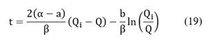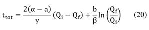 No closed form analytic solutions for integrals , , , and could be found but they present no problem for numerical methods. However, those integrals include the flow rate Q, and, thus, Eq. (28) in not an explicit relation between t and Q and must be solved iteratively. Therefore, we must propose a first guess for the flow rate, (the value obtained in the analytic solution may be used). With we proceed to calculate and using Eq. (12) and Eq. (13), using Eq. (15), by its definition, the friction factor by Eq. (23), and finally using Eq. (10). We will probably get . The process must, therefore, be repeated, restarting with , obtaining , and proceeding until some prescribed precision, , is obtained at iteration n, where . All other variables, as , , and, , and , the diameters, etc., are input data for the problem. With the converged value of the integrals , , , and may be numerically evaluated and the relation may be obtained from Eq. (28). The calculation of is analogous. The total transfer time can finally be calculated, substituting the value of into Eq. (28). The relation can be numerically inverted to yield the dependence . See [14] for more information about the model.