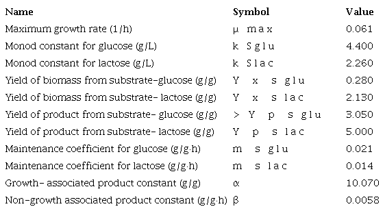 The kinetics with double Monod relation, constant yield relation (for glucose and lactose) and product formation are shown in eqs. (5)-(9).