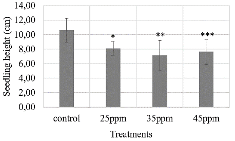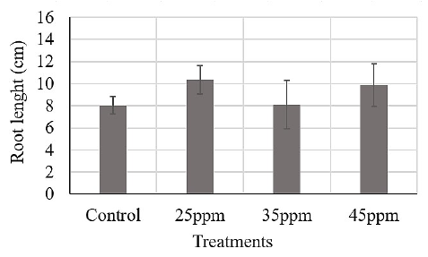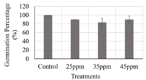 Previous results suggested that the iron contents evaluated did not have a negative effect on maize seeds. To determine if this result is consistent with another type of crop, aqueous suspensions of nanoparticles with iron contents of 25, 35 and 45 ppm were evaluated on Lettuce seeds. In addition, to demonstrate not only the effect of this suspension on seed germination, but also on the growth and development of its seedlings, an in vitro assay was performed, as explained in the methodology, section 2.4.