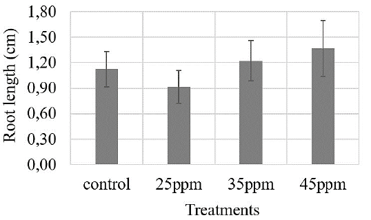 Lettuce seeds were impregnated with the different nanoparticle suspensions in a wet chamber test to evaluate the effect of these nanocomposites on the seeds. As a result, the germination percentage of the seeds was higher than 67 % (75 % for the control treatment, 72 % for the 25 ppm and 45 ppm treatments, 67 % for the 35 ppm treatment, p-value ANOVA test 0,802). As for the root length variable, no statistically significant differences were observed from the control treatment and between the treatments, according to the ANOVA test (Fig. 3), suggesting that there is no phytotoxic effect of the suspension of magnetic nanoparticles on these seeds.