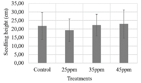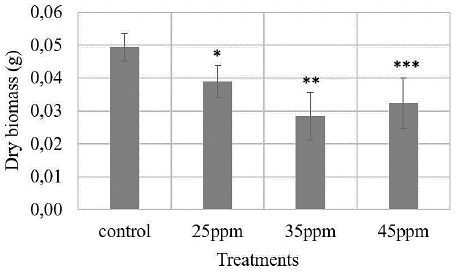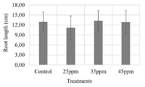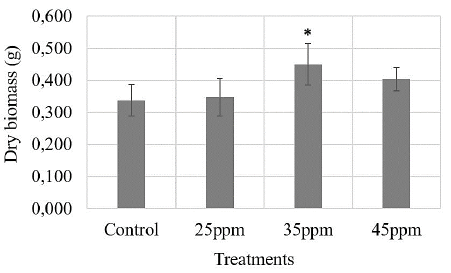 Regarding root length and seedling height measurements, 35 ppm treatment was the one that presented a higher value than the other treatments. However, neither showed statistically significant differences (Figs. 4, 5). The opposite was the case for the dry biomass variable, in which the control treatment had the lowest value and showed a statistically significant difference with the 35 ppm treatment (Fig. 6), which could support the above results, suggesting that the nanoparticle suspensions do not have a phytotoxic effect on maize seeds.