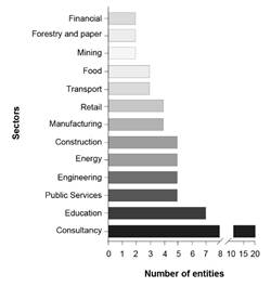 The 65 organizations involved in this study come from 13 different economic sectors (Fig. 2). With 19 organizations, the consulting sector had the highest participation. The education sector came in second with seven participants, including universities and educational foundations. Four organizations represented the construction sector as well as the manufacturing sector and the retail sector. Three organizations remained in the transportation and food sectors. Finally, the mining, forestry and paper, and financial sectors each had two organizations.