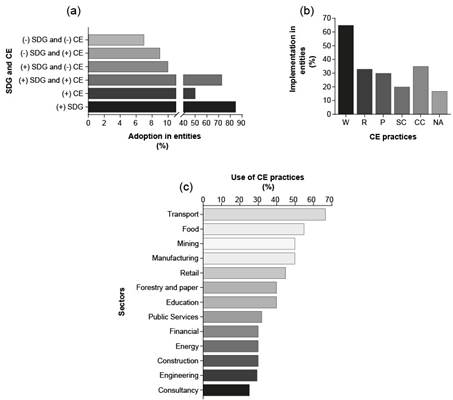 The study's findings shed light on the status of entities affiliated with the Global Compact Network Colombia in terms of support to achieve the SDGs and CE. Most entities have put these two initiatives into practice. The food and transportation sectors are the most aligned towards CE. However, several entities, mainly from the financial, retail and forestry sectors, are unaware of the existence of CE or misunderstand its meaning. Waste management is the most used CE practice, while supply chain management is underutilized, presenting opportunities for innovation. Incentivizing CE requires national programs that encourage greater collaboration among supply chain actors, such as manufacturers, suppliers, retailers, consumers, and local governments.